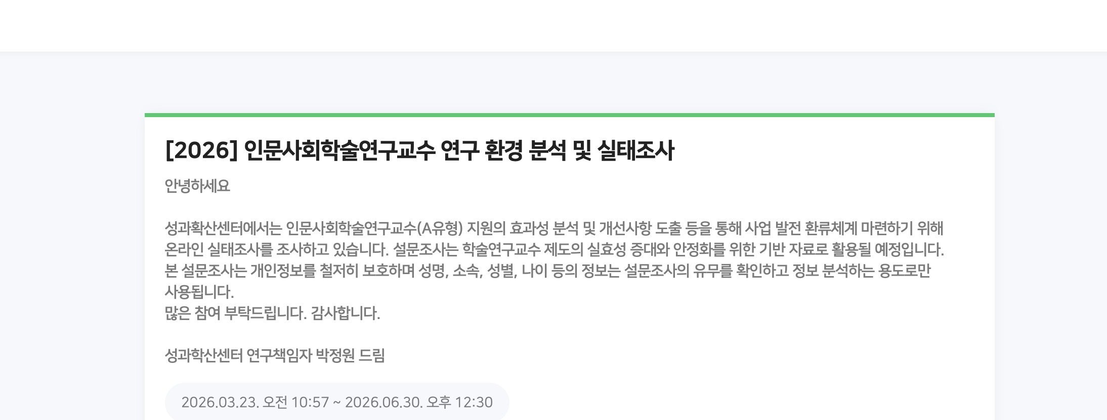 🌈 인문사회학술연구교수 연구 환경 분석 및 실태조사를 진행하고 있습니다! (~26.06.30(화)마감)