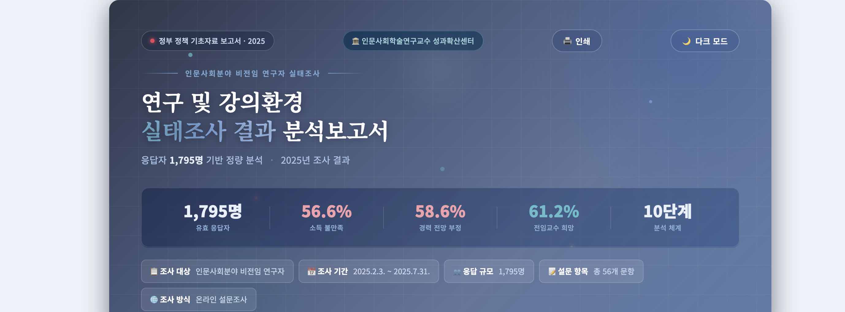 2025년 2월 3일부터 7월 31일까지 실시된 실태조사에 적극적으로 참여해주신 교수님들께 진심으로 감사드립니다. 인문사회분야 비전임 연구자 실태조사는 비전임 연구자의 지속가능한 연구 생태계 조성을 위한 기초자료 확보 및 정책 수립 근거 마련을 목적으로 진행된 전국 단위의 대규모 설문조사로 총 1,795분이 참여해주셨습니다. 참여자의 응답 데이터를 기반으로 정량 및 정성 분석을 병행한 분석보고서는 아래 링크를 클릭하시거나 학술연구교수 성과확산센터 웹페이지에서 확인하실 수 있습니다.